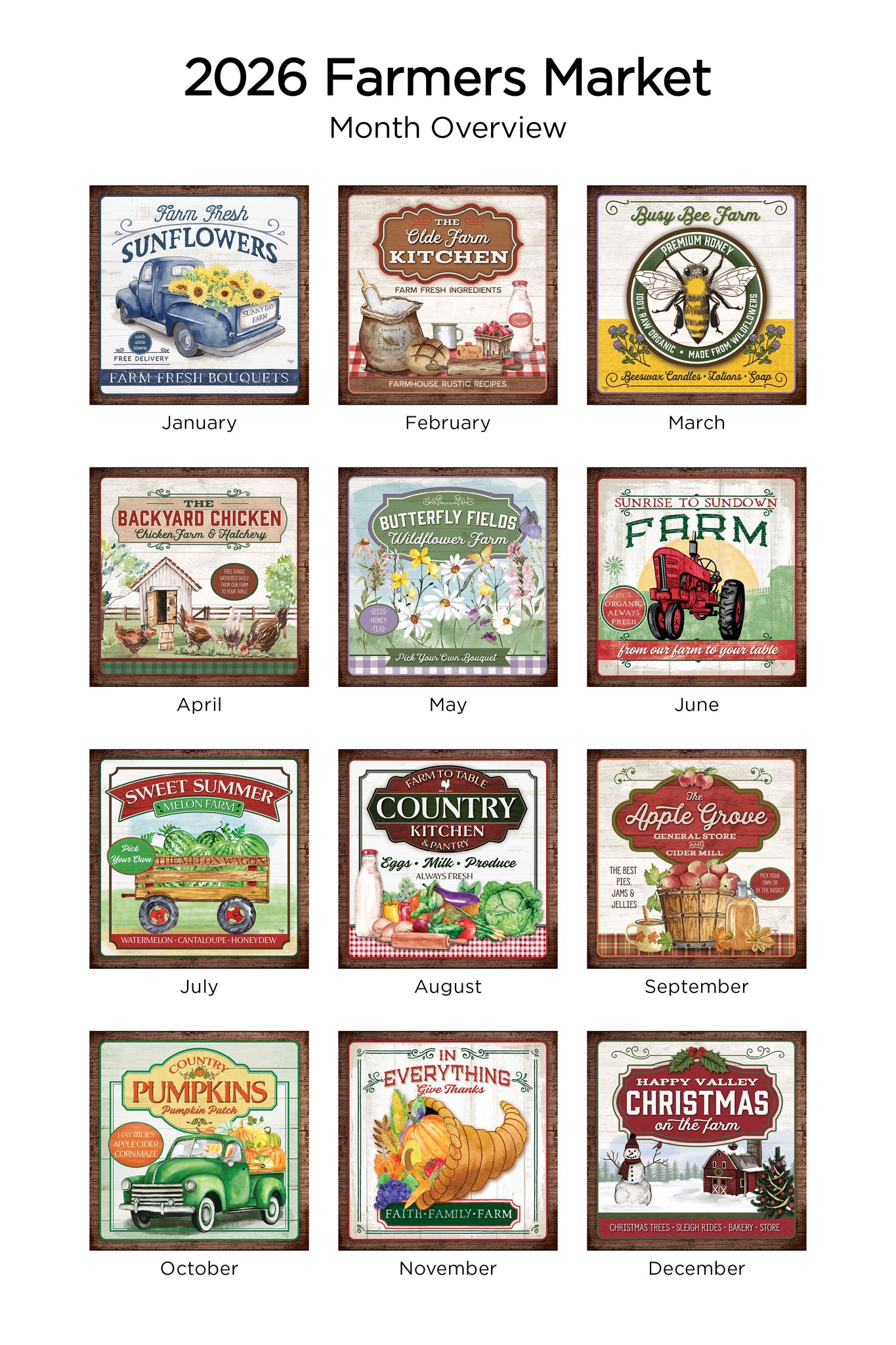 Rise and Shine! This 2026 Farmers Market 12x24 refill sheet calendar is ripe for the picking with artwork from Mollie B. Full of bright colours and rich textures that will liven up any space.
