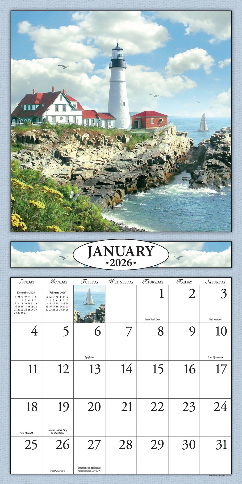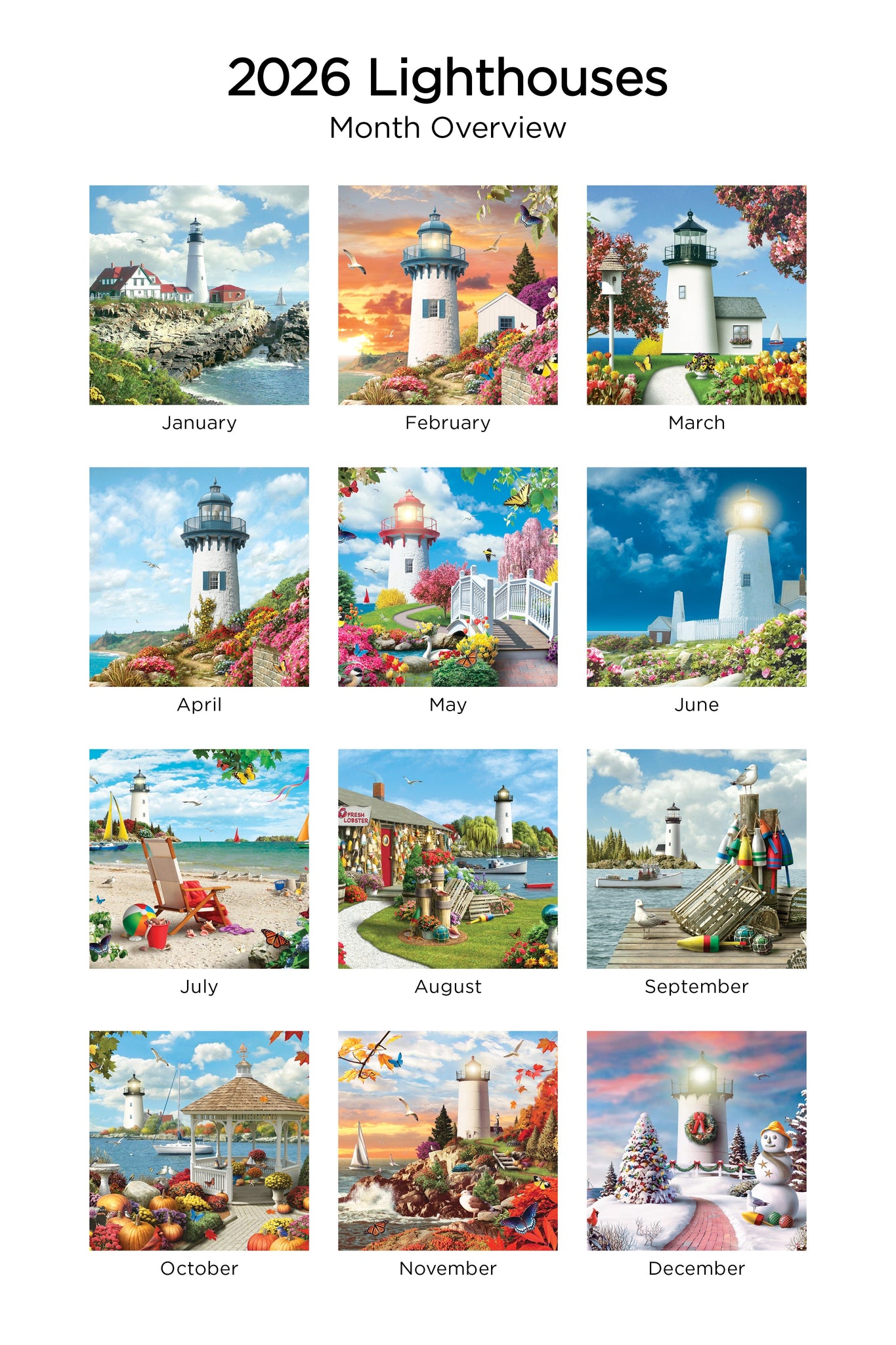 While the lighthouses' purpose is to provide ships with a navigational point of reference, these beautiful structures have become symbols of many seaside communities. This 2026 - 12x24 Refill Sheet Calendar captures both the strength and beauty enjoyed by land-lovers and sea goers alike.