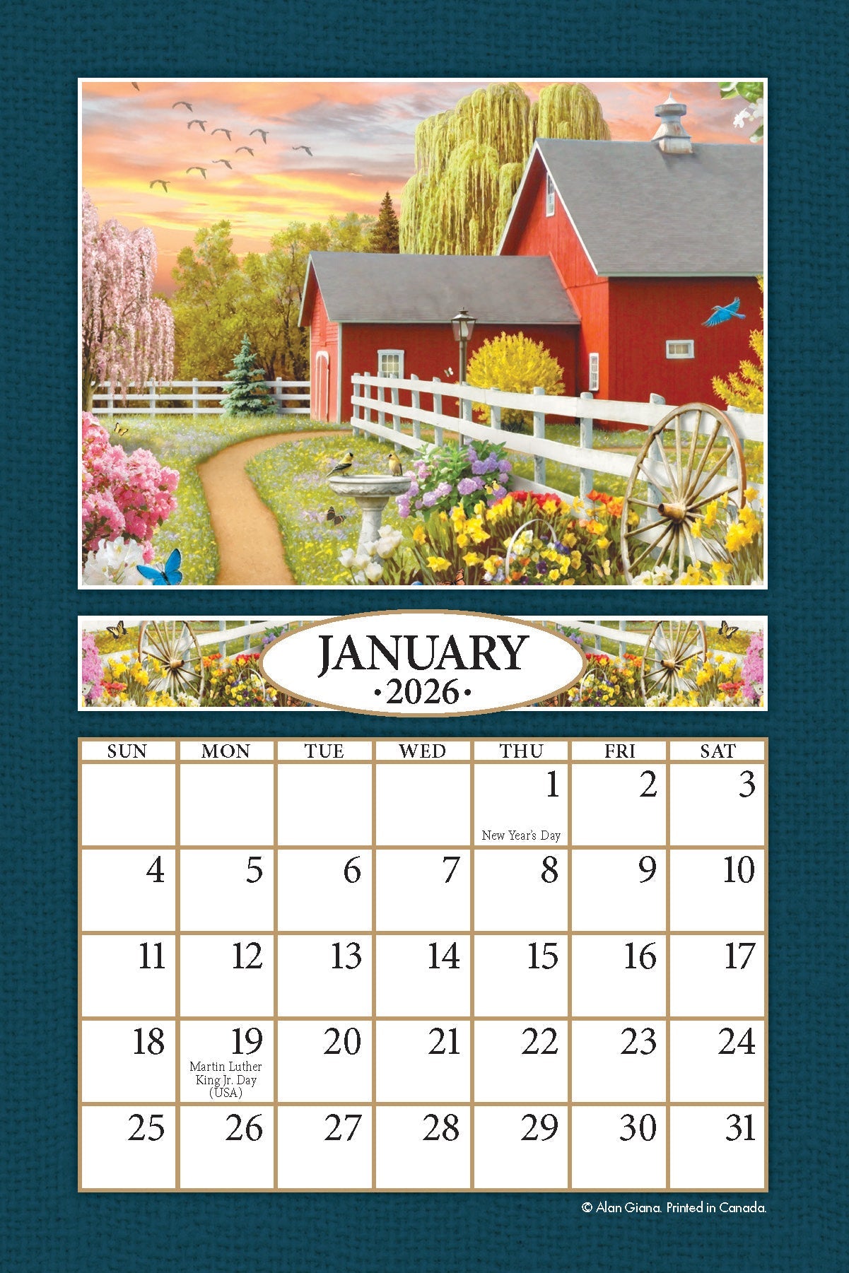 This 2026 - 4x6 Refill Sheet Calendar of Alan Giana’s paintings of colorful paths, charming country hideaways, and tranquil coastal waterways, bring us to peaceful places; places where we can escape for a moment and appreciate all of the beauty around us.